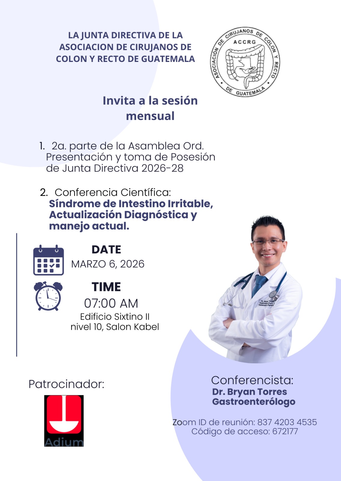 06 marzo 26 – Síndrome de Intestino Irritablexentra2026-03-12T23:31:58+00:00 06 marzo 26 – Síndrome de Intestino Irritable FECHA: 06 marzo 2026 LUGAR: Sixtino 2, Salón K’bel CONFERENCISTA: Dr. Byron Torres – Gastroenterólogo PATROCINADOR: Adium Comparte esta historia, elige tu plataforma! FacebookXLinkedInWhatsAppTumblrPinterestCorreo electrónico Proyectos relacionados SIMPOSIUM Noviembre 03 octubre 2025 – Cirugía guiada por fluorescencia con ICG 05 septiembre 25 – Lesión de Dieulafoy como etiología infrecuente de hemorragia gastrointestinal iferior 01 agosto 25 – Técnicas Quirúrgicas de Hemicolectomía Derecha Robótica y RAB Robótico